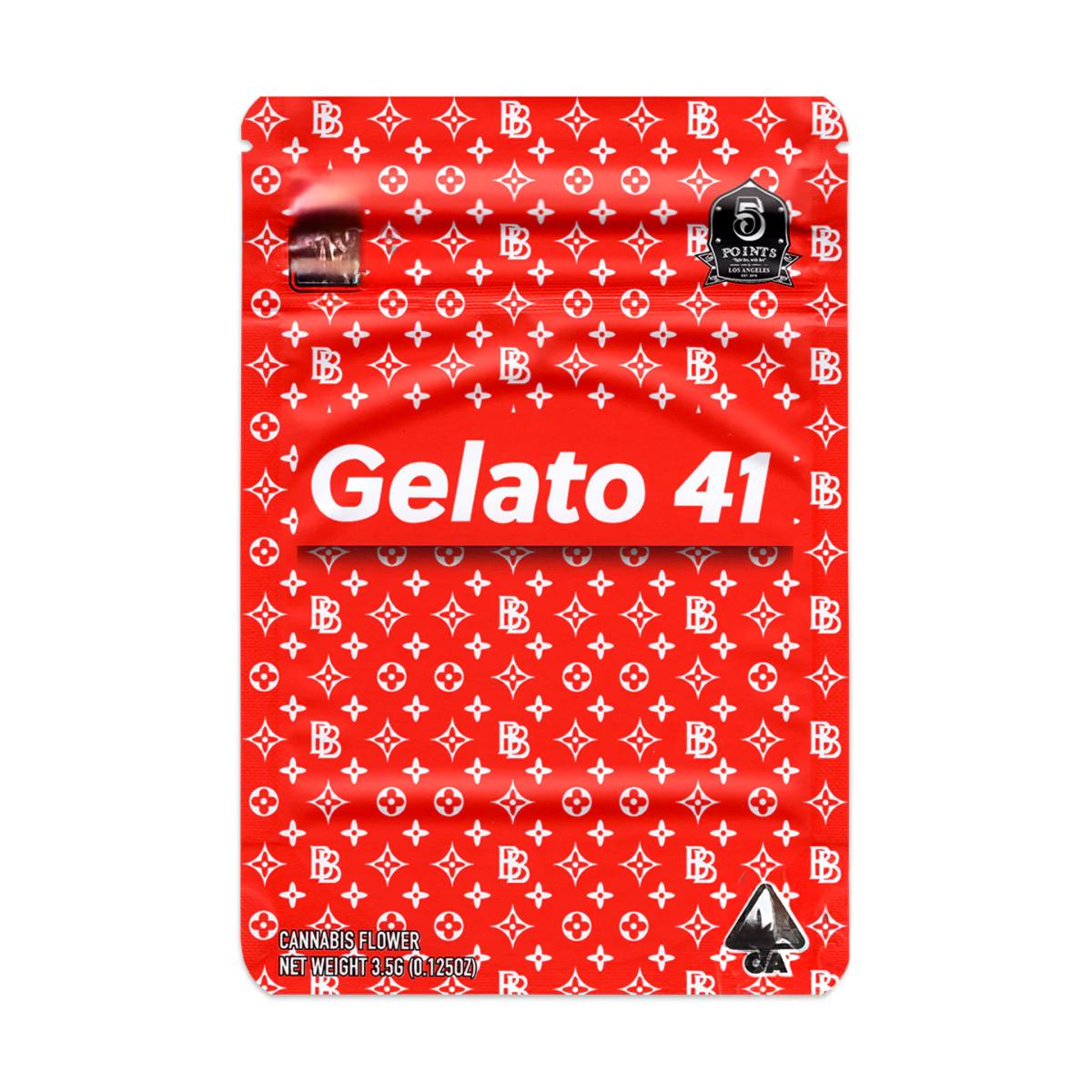 Gelato 41 descends from the Gelato lineage, originally bred by crossing Sunset Sherbet with Thin Mint Girl Scout Cookies (GSC); Gelato #41 is a standout phenotype from this family and often traced to selections stabilized by breeders such as Sherbinski / Cookie Fam.